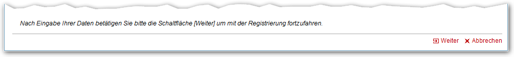 In diesem Fall werden Benutzername und Kennwort nach internen Richtlinien automatisch erzeugt und nach erfolgreicher Registrierung an die von Ihnen hinterlegte E-Mail-Adresse gesendet. Mit dem Funktionslink Weiter können Sie in die nächste Registerkarte wechseln. -