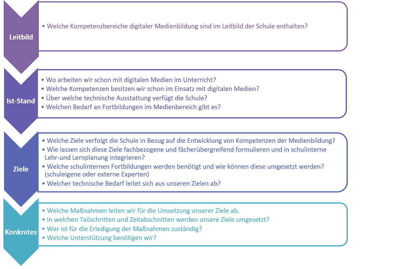 Orientieren Sie sich zuerst am Leitbild der Schule. Überprüfen Sie ihre Schwerpunkte und klären Sie ihr Grundverständnis von Medienbildung/Digitalisierung ab, indem Sie Ziele für ihre Schulgemeinschaft formulieren.
