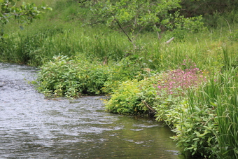 Das Bild zeigt ein Flussufer. Der niedrige Wasserstand an dieser Stelle des Flusses und der üppige Uferbewuchs sind gut zu erkennen. Das Bild ist unter CC0 lizenziert und kann somit frei verwendet werden.