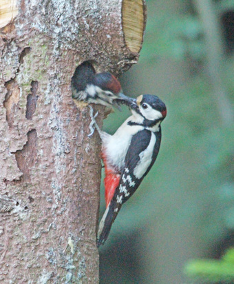 Das Foto hehört zur Serie "Spechtvögel". Es zeigt einen Buntspecht (Dendrocopos major) beim Füttern eines Jungvogels. Es gelten die Nutzungsbedingungen der Mediothek und Pixiothek.