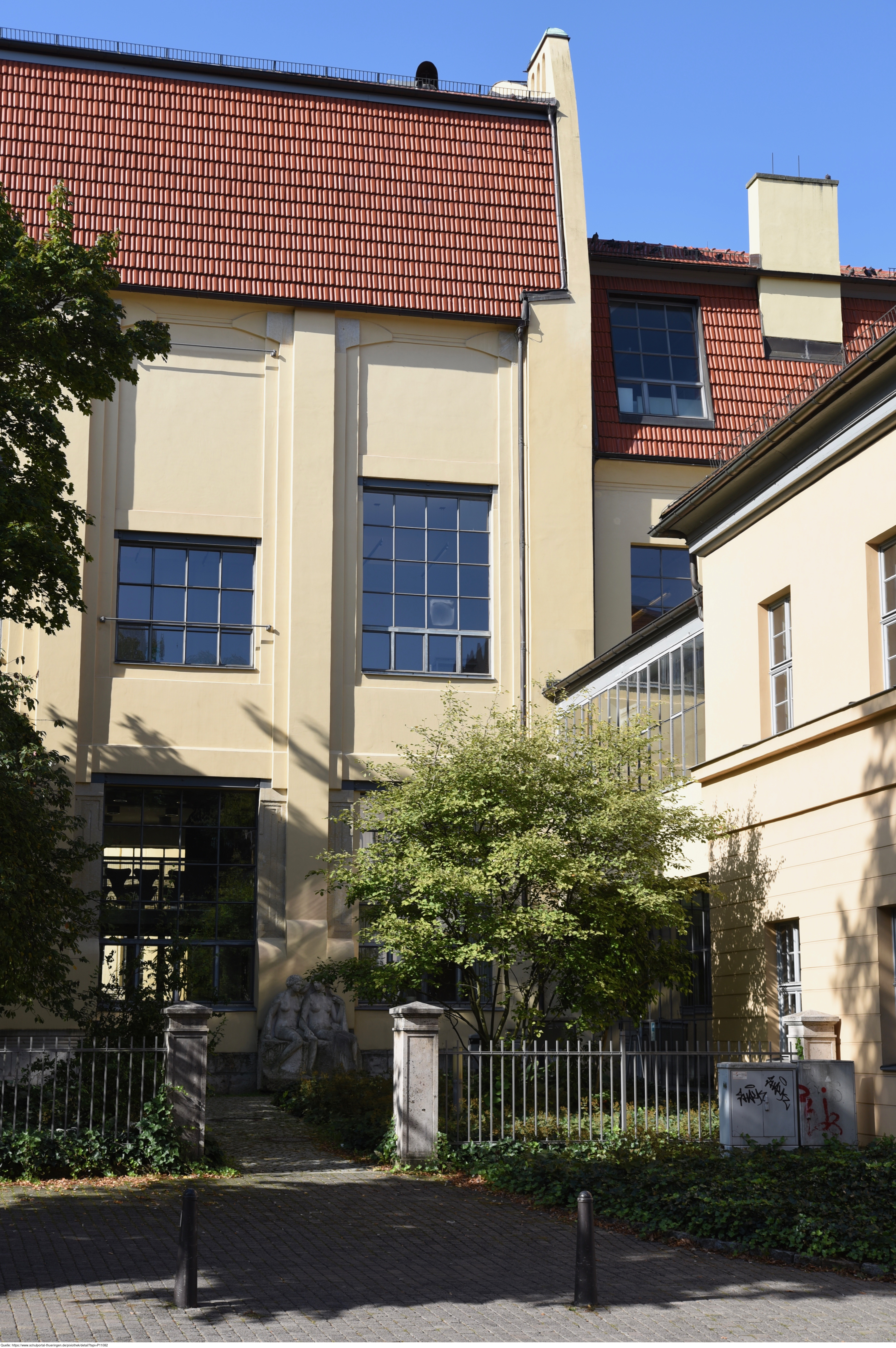 Das Foto gehört zur Serie "Bauhaus in Weimar". Im Zeitrahmen 1904 bis 1911 wurde nach Plänen Henry van de Veldes die Kunstgewerbeschule und später der Hochschulbau für Bildende Kunst in Weimar errichtet (heutiges Hauptgebäude der Bauhaus-Universität Weimar). Es ist eines der bedeutendsten Kunstschulbauten der Jahrhundertwende und war 1919 Gründungsort des von Walter Gropius ins Leben gerufene Staatlichen Bauhauses. Nach Art und Konzeption war es in dieser Zeit etwas völlig Neues, da das Bauhaus eine Zusammenführung von Kunst und Handwerk darstellte. Es gelten die Nutzungsbedingungen der Mediothek und Pixiothek.