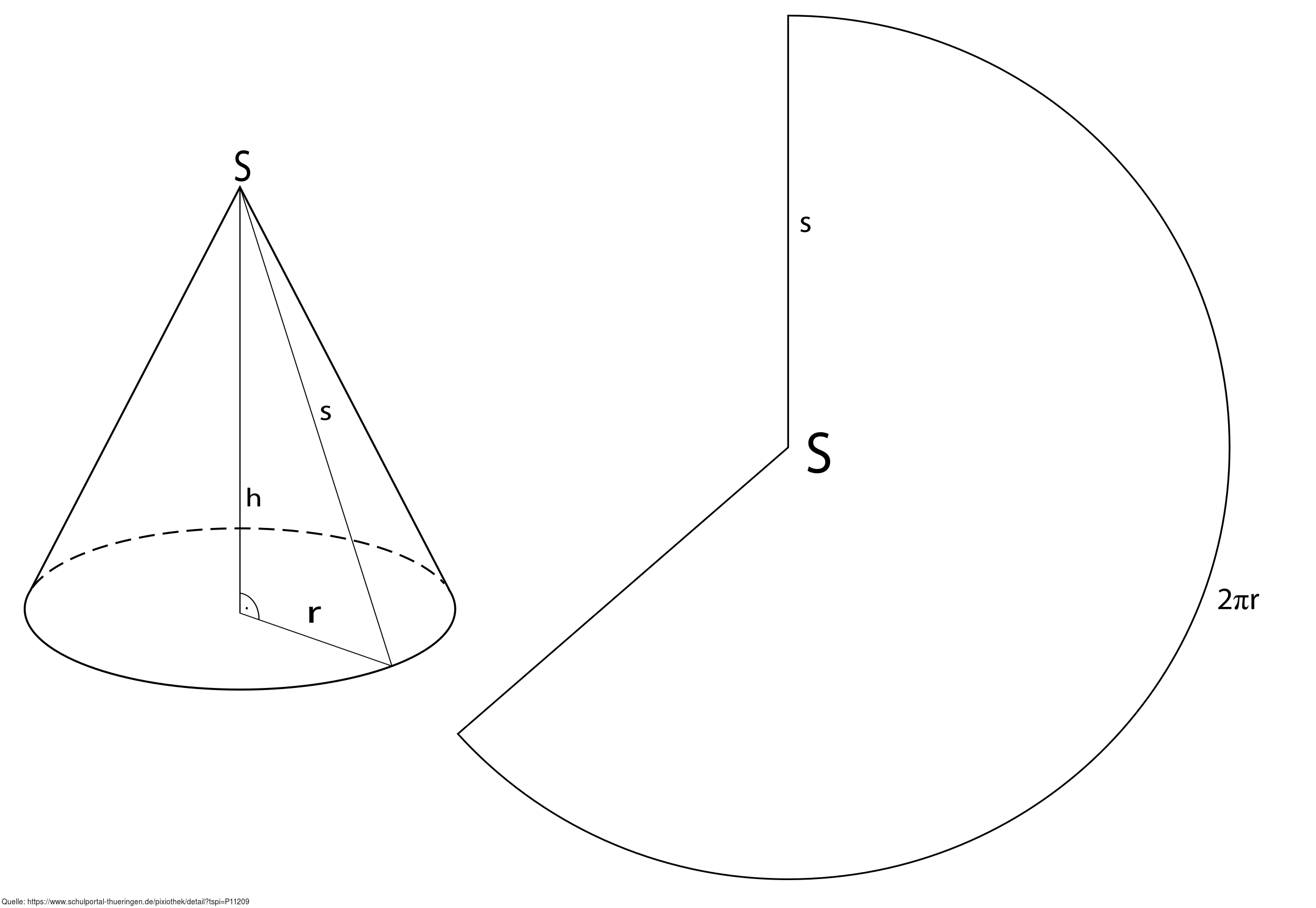 Das Bild gehört zur Serie "Geometrie Körper". Es zeigt einen geraden Kreiskegel und seine aufgerollte Mantelfläche. Das Bild ist unter CC0 lizenziert und kann somit frei verwendet werden.