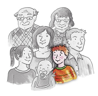 Das Bild gehört zur Serie "Familienmitglieder als Zeichnung". Es zeigt den Bruder im Kreise seiner Familie. Es gelten die Nutzungsbedingungen der Mediothek und Pixiothek.