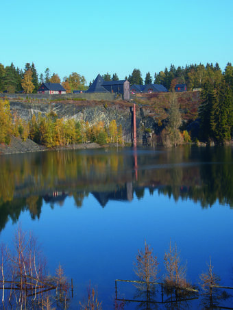 Das Bild gehört zur Serie "Thüringischer Schieferpark Lehesten". Es zeigtden sogenannten Schiefersee, der das Innere des ehemaligen Tagebaus bedeckt. Im Hintergrund sind die Göpelschachtanlage und ein teilweise überfluteter Schornstein zu sehen. Es gelten die Nutzungsbedingungen der Mediothek und Pixiothek.