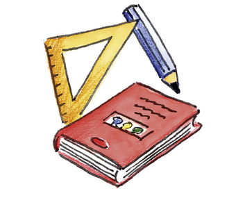 Das Bild gehört zur Serie "Schreibwaren". Es zeigt gezeichnete Unterrichtsmaterialien: Bleistift, Schreibheft, Dreieck. Es gelten die Nutzungsbedingungen der Mediothek und Pixiothek.