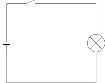 Das Bild gehört zur Serie "Elektrische Schaltungen". Es zeigt den Schaltplan eines einfachen Stromkreises mit Spannungsquelle (Batterie), Schalter und einem Verbraucher (Glühlampe). Das Bild ist unter CC0 lizenziert und kann somit frei verwendet werden.