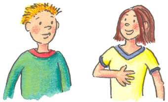 Das Bild gehört zur Serie "Kinder". Es zeigt einen gezeichneten Jungen und ein Mädchen im Gespräch. Es gelten die Nutzungsbedingungen der Mediothek und Pixiothek.