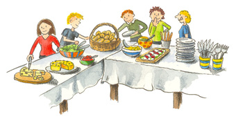 Das Bild zeigt die Vorbereitung eines Büfett. Es gelten die Nutzungsbedingungen der Mediothek und Pixiothek.