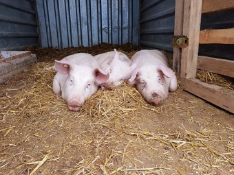 Das Foto gehört zur Serie "Bauernhof". Es zeigt Schweine im Schweinestall. Es gelten die Nutzungsbedingungen der Mediothek und Pixiothek.