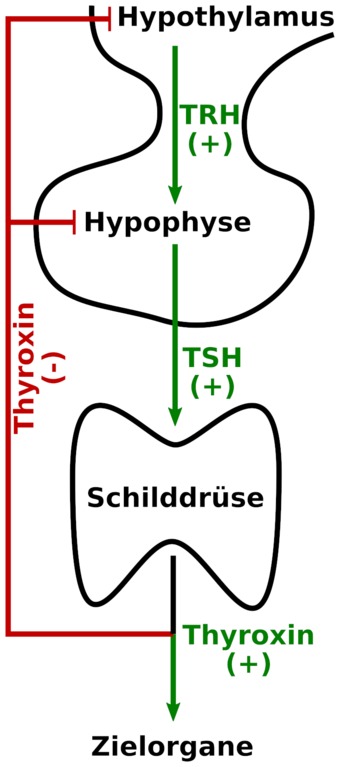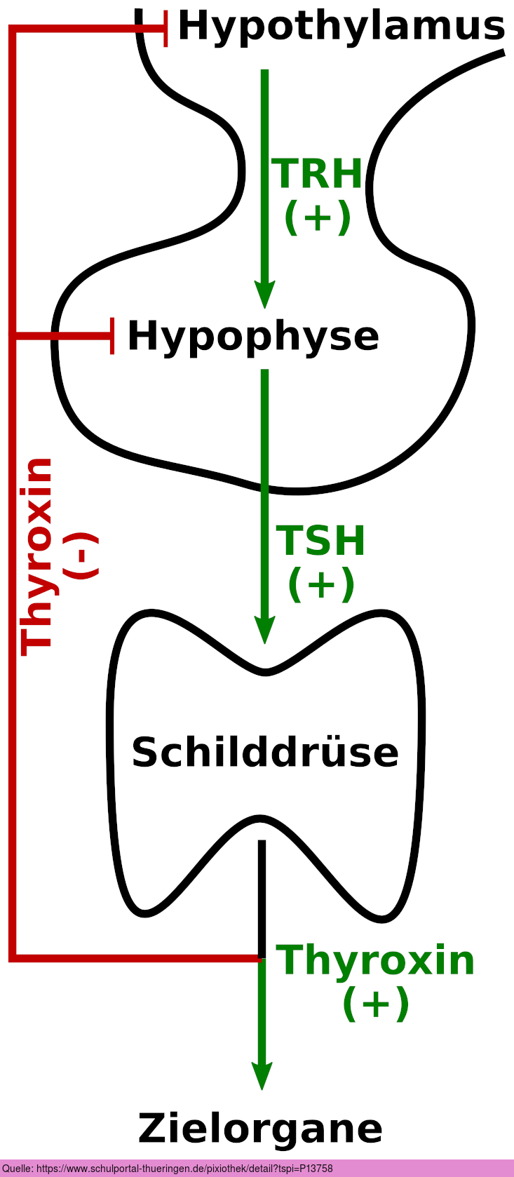 Regulierung der Ausschüttung des Schilddrüsenhormons Thyroxin durch negative Rückkopplung. Es gelten die Nutzungsbedingungen der Mediothek und Pixiothek. Auf http://unterricht.petzinger.net/biochdropbox.html auch als svg und in CC-BY verfügbar.