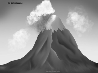 Das Bild gehört zur Serie "Grafische Darstellung Alpenföhn". Das Bild verdeutlicht den Alpenföhn (Föhnwind des Alpenraumes). Bild-Variante: Berg mit Wolken und Niederschlag; s/w; unbeschriftet. Es gelten die Nutzungsbedingungen der Mediothek und Pixiothek.