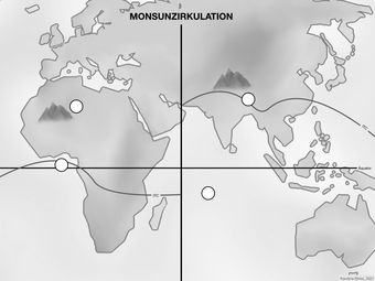 Das Bild gehört zur Serie „Zirkulationssysteme der Erde“. Es verdeutlicht die Monsunzirkulation der Erde. Bild-Variante: s/w; leere Vorlage. Es gelten die Nutzungsbedingungen der Mediothek und Pixiothek.