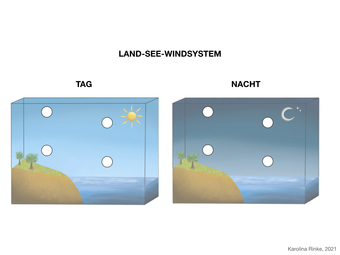 Das Bild gehört zur Serie „Zirkulationssysteme der Erde“. Es verdeutlicht das Land-See-Windsystem der Erde. Bild-Variante: farbig; unbeschriftet. Es gelten die Nutzungsbedingungen der Mediothek und Pixiothek.