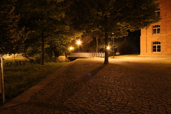 Motiv eines Stadtrundganges durch Pößneck (Ostthüringen) bei Nacht. Abgebildet ist eine Brücke über die Kotschau. Es gelten die Nutzungsbedingungen der Mediothek und Pixiothek.