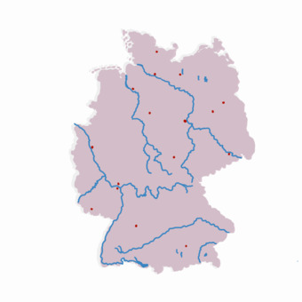 Das Bild zeigt eine stumme Karte von Deutschland mit den wichtigsten großen Flüssen und ausgewählten Großstädten. Das Bild ist unter CC0 lizenziert und kann somit frei verwendet werden.