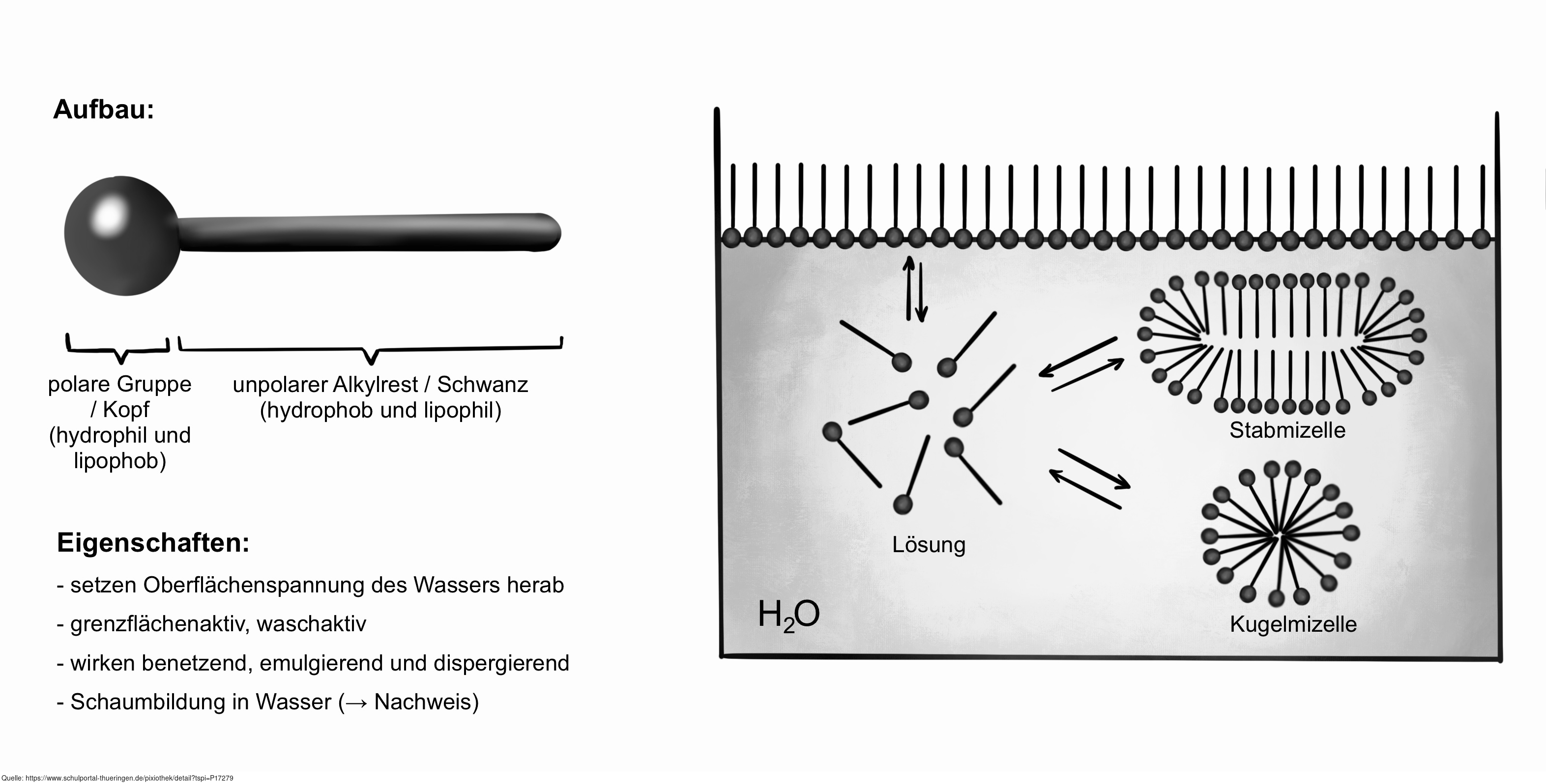 Das Bild verdeutlicht den allgemeinen Aufbau eines Tensids sowie die Mizellenbildung in Wasser. Variante: s/w; beschriftet. Es gelten die Nutzungsbedingungen der Mediothek und Pixiothek.