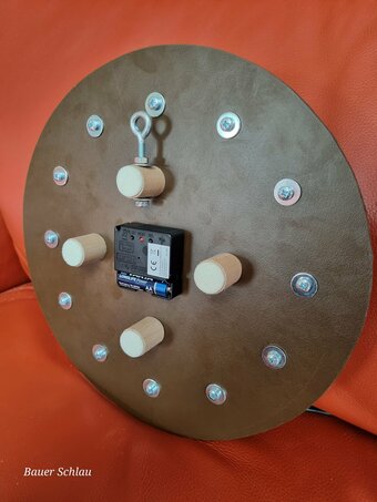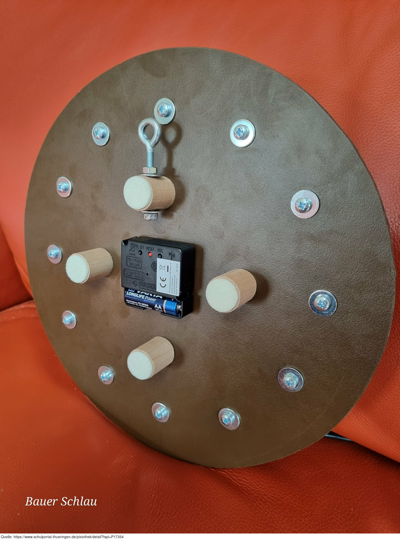 Das Bild zeigt eine Uhr unter Verwendung von Billardkugeln. Das Foto kann als Anregung für ein Technikprojekt dienen. Es gelten die Nutzungsbedingungen der Mediothek und Pixiothek.