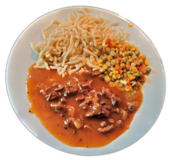 Das Bild zeigt ein Tellergericht mit Nudeln bzw. Spätzle, Mischgemüse, Gulasch und Tomatensoße.. Es gelten die Nutzungsbedingungen der Mediothek und Pixiothek.