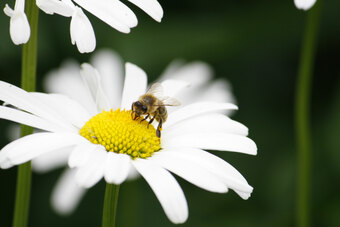 Das Bild gehört zur Serie "Saalfelder Honig", aufgenommen vom Imker Bernd Rümpler, Inhaber von saalfelder-honig.de. Zu sehen ist eine Honigbiene (Flugbiene) auf der Blüte einer Margeritte.