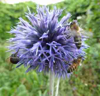 Das Bild gehört zur Serie "Saalfelder Honig", aufgenommen vom Imker Bernd Rümpler, Inhaber von saalfelder-honig.de. Zu sehen sind Honigbienen (Flugbienen) auf der Blüte einer Kugeldistel.