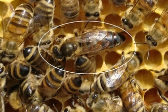 Das Bild gehört zur Serie "Saalfelder Honig", aufgenommen vom Imker Bernd Rümpler, Inhaber von saalfelder-honig.de. Zu sehen ist eine Bienenkönigin (ungezeichnet) umringt von Arbeiterinnen (Stockbienen).