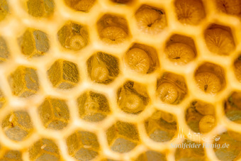 Das Bild gehört zur Serie "Saalfelder Honig", aufgenommen vom Imker Bernd Rümpler, Inhaber von saalfelder-honig.de. Zu sehen ist eine Bienenwabe mit Eiern und Maden. Links unten: frisch gelegte Eier (Stifte). Darüber: kleine geschlüpfte Maden im Futtersaft. Rechts oben: große Maden im Futtersaft.