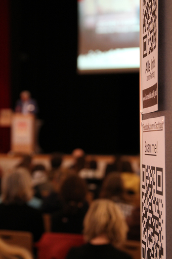 Das Bild ist Teil der Serie „Veranstaltungen“. Es zeigt einen Blick in den Vortragssaal und im Eingangsbereich einen Infobereich mit 2 QR-Codes. Es gelten die Nutzungsbedingungen der Mediothek und Pixiothek.