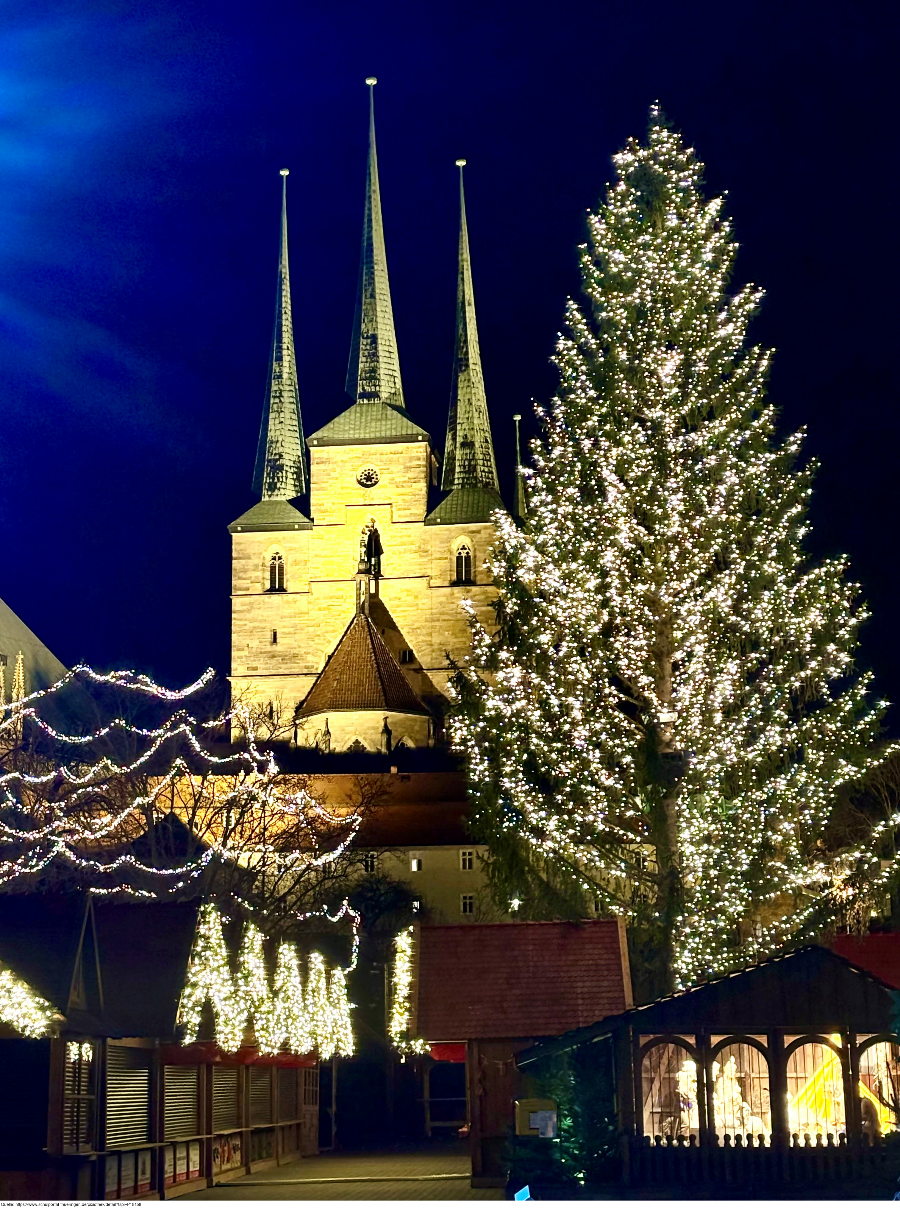 Das Foto gehört zur Serie "Weihnacht". Das Bild zeigt den Weihnachtsbaum von 2024 auf dem Erfurter Weihnachtsmarkt vor der St. Severi-Kirche. Es ist ein ca. 25m hohe Rotfichte. Es gelten die Nutzungsbedingungen der Mediothek und Pixiothek.