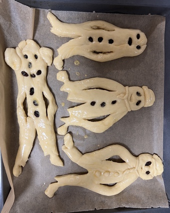 Das Foto zeigt einige zum Backen vorbereitete Teiglinge von Weckmännern. Als Weckmann wird ein Gebäck in Form eines stilisierten Mannes aus Hefeteig bezeichnet, welches oftmals mit Rosinen verziert ist. Es gelten die Nutzungsbedingungen der Mediothek und Pixiothek