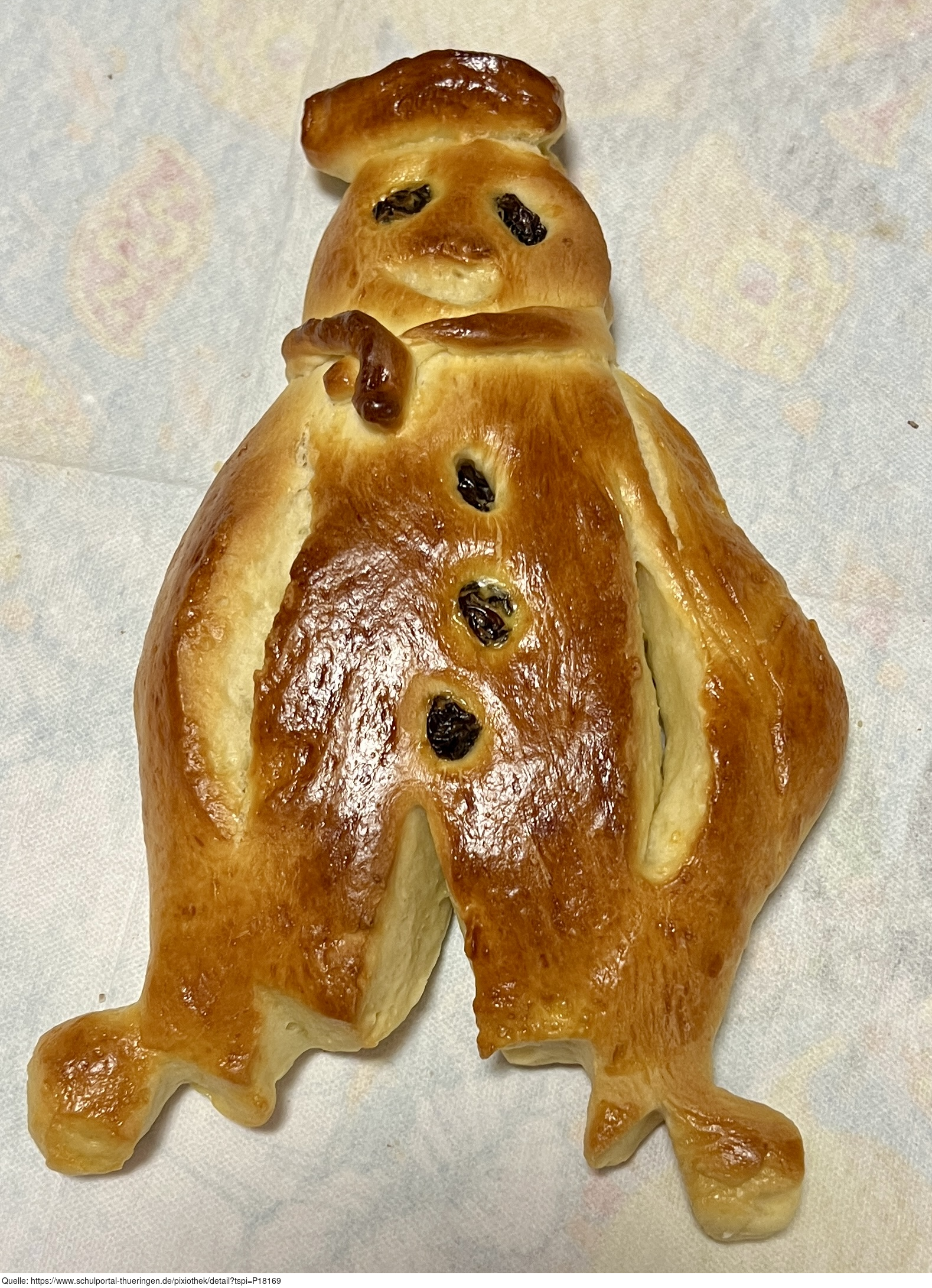 Das Foto zeigt einen fertig gebackenen Weckmann. Als Weckmann wird ein Gebäck in Form eines stilisierten Mannes aus Hefeteig bezeichnet, welches oftmals mit Rosinen verziert ist. Es gelten die Nutzungsbedingungen der Mediothek und Pixiothek
