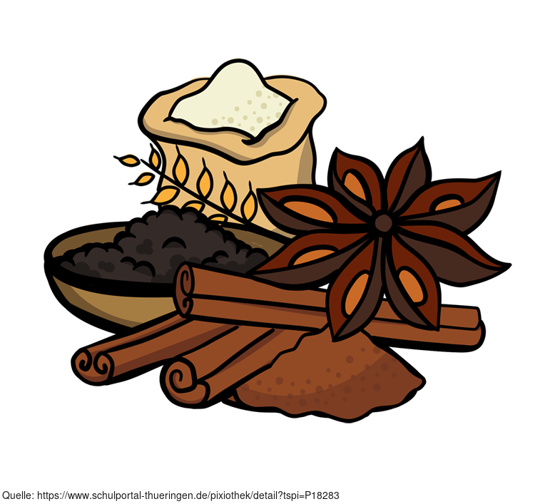 Das Bild zeigt einen gezeichneten Sack mit Getreide und die Gewürze Anis, Zimt, Pfeffer. Es stammt aus dem Projekt "Didactica Bavaria Bohemia" - Materialpakete daraus siehe "Verwandte Medien (Auswahl)". Das Bild ist unter CC0 lizenziert und kann somit frei verwendet werden.