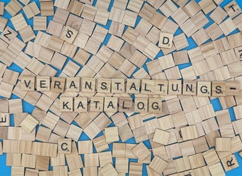 Aus Buchstaben wurde das Wort "Veranstaltungskatalog" gelegt. Es gelten die Nutzungsbedingungen der Mediothek und Pixiothek.