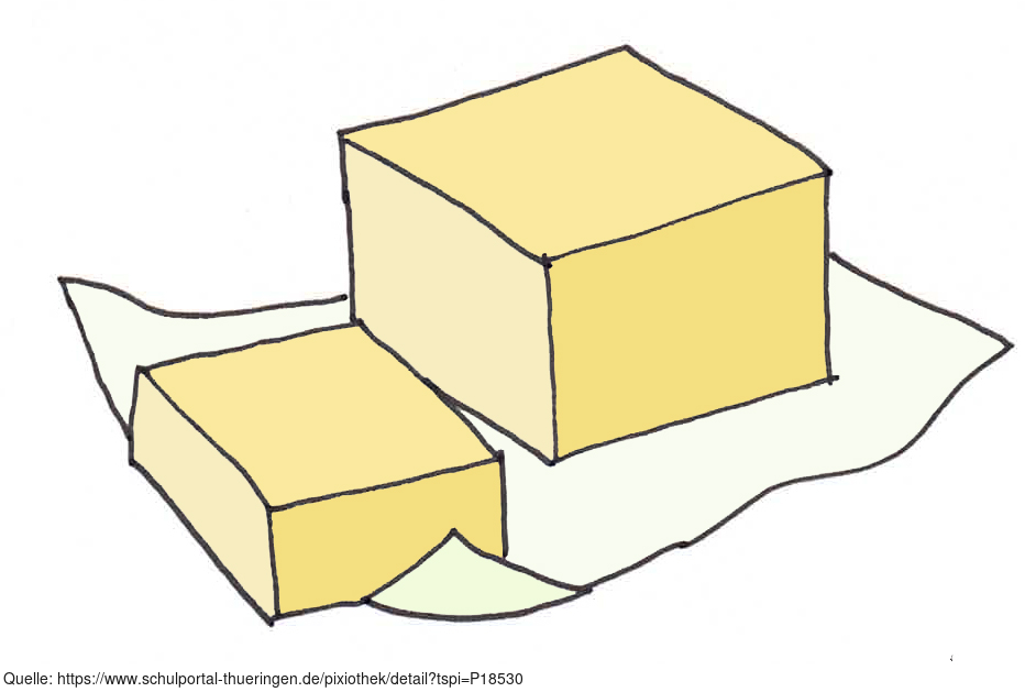 Das Bild zeigt ein gezeichnetes Stück Butter (farbig). Es gehört zur Serie "Ernährungspyramide zum Basteln und Gestalten" und findet u.a. im gleichnamigen Lernobjekt unter https://www.schulportal-thueringen.de/web/guest/media/detail?tspi=18517 Verwendung. Es gelten die Nutzungsbedingungen der Mediothek und Pixiothek.