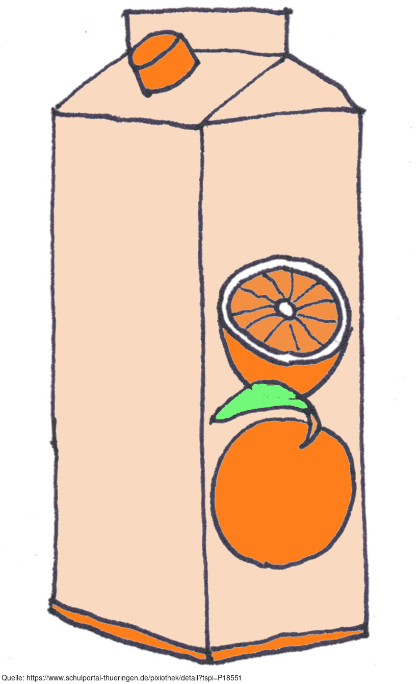 Das Bild zeigt eine gezeichnete Packung Orangensaft (farbig). Es gehört zur Serie "Ernährungspyramide zum Basteln und Gestalten" und findet u.a. im gleichnamigen Lernobjekt unter https://www.schulportal-thueringen.de/web/guest/media/detail?tspi=18517 Verwendung. Es gelten die Nutzungsbedingungen der Mediothek und Pixiothek.