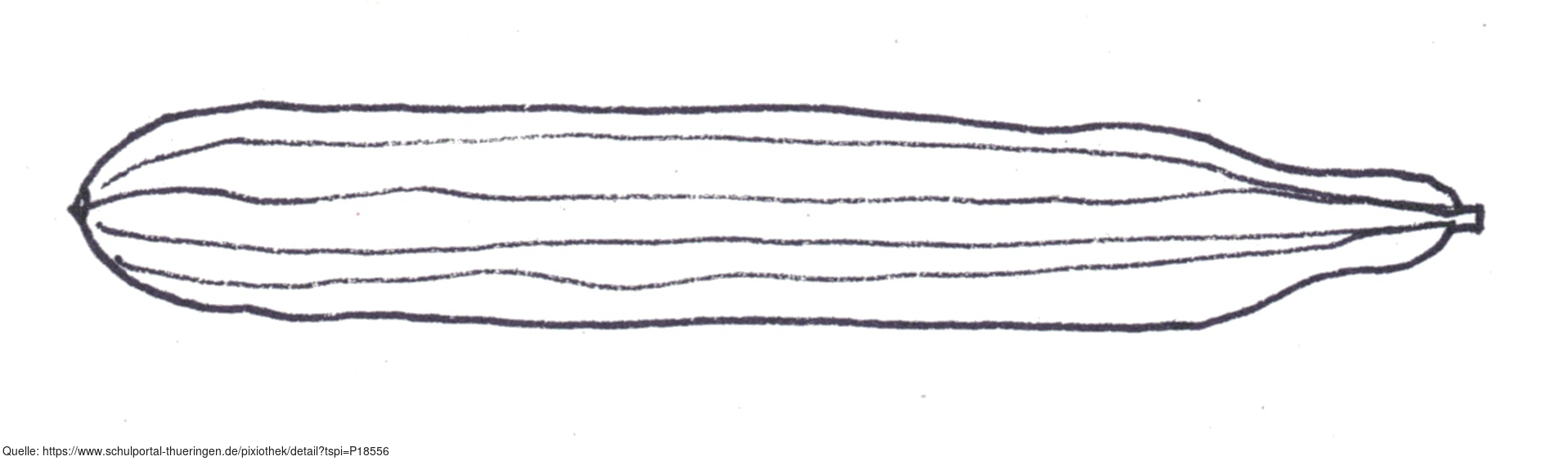 Das Bild zeigt eine gezeichnete Salatgurke (s/w). Es gehört zur Serie "Ernährungspyramide zum Basteln und Gestalten" und findet u.a. im gleichnamigen Lernobjekt unter https://www.schulportal-thueringen.de/web/guest/media/detail?tspi=18517 Verwendung. Es gelten die Nutzungsbedingungen der Mediothek und Pixiothek.