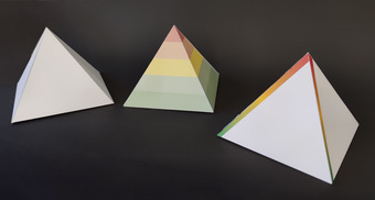 Das Bild zeigt drei Pyramiden aus Papier. Es gehört zur Serie "Ernährungspyramide zum Basteln und Gestalten" und findet u.a. im gleichnamigen Lernobjekt unter https://www.schulportal-thueringen.de/web/guest/media/detail?tspi=18517 Verwendung. Es gelten die Nutzungsbedingungen der Mediothek und Pixiothek.