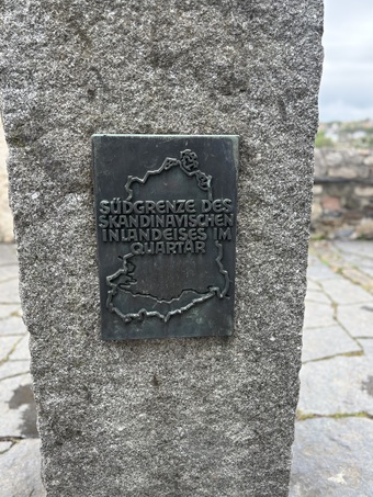 Das Bild zeigt den Eiszeitstein im Burggarten der Osterburg in Weida. An dem Stein ist eine Tafel angebracht, die die ungefähre Südgrenze der skandinavischen Inlandvereisung im Quartär zeigt.