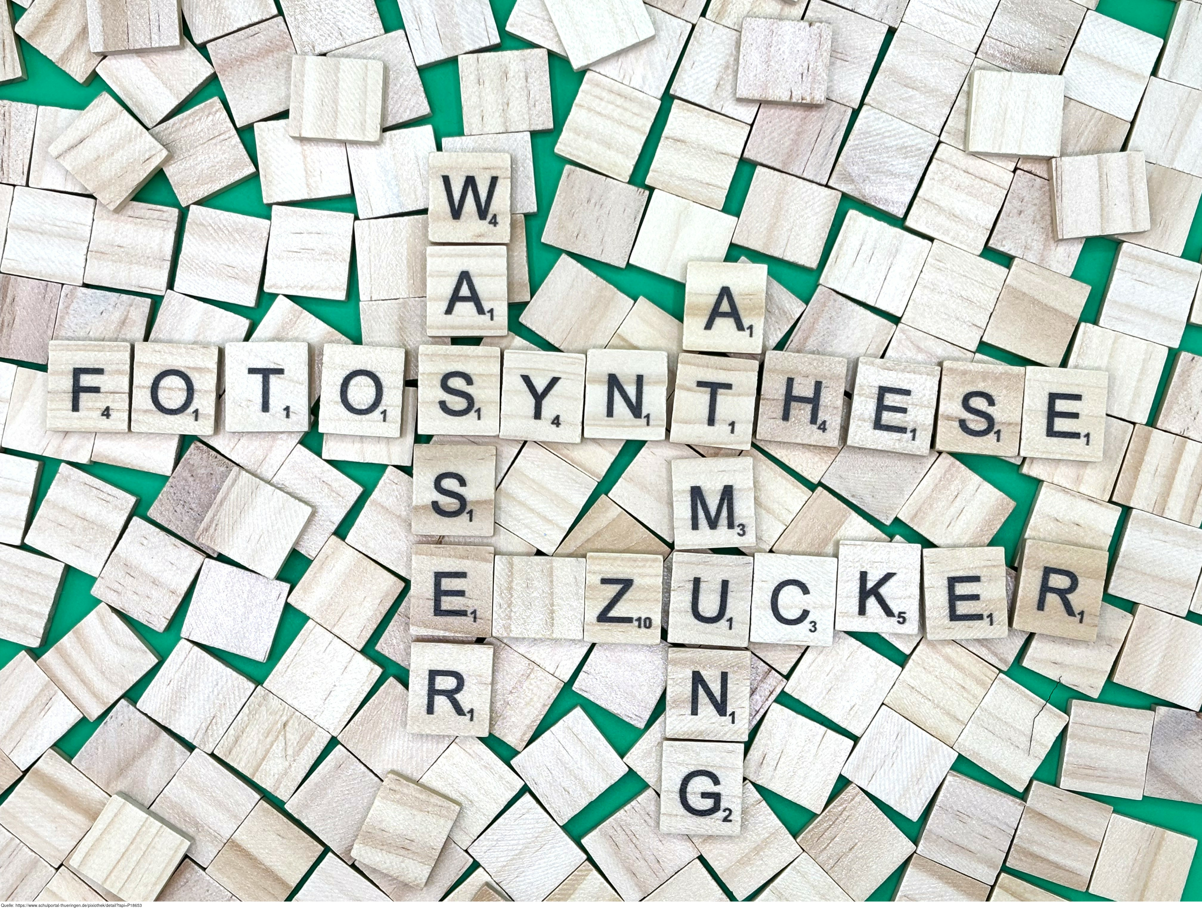 Aus Buchstaben wurden die Begriffe "Fotosysnthese", "Wasser", "Atmung" und "Zucker" gelegt. Es gelten die Nutzungsbedingungen der Mediothek und Pixiothek.