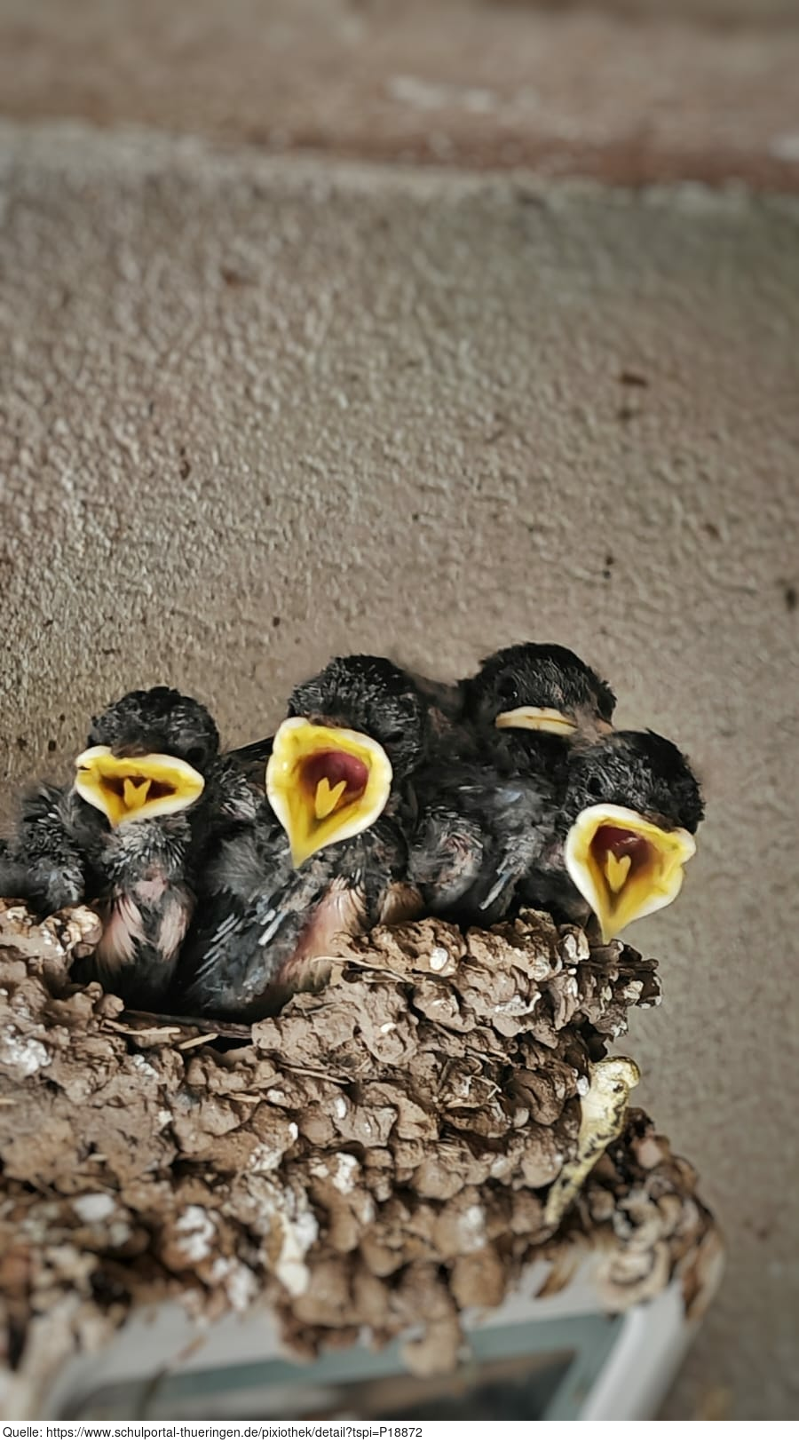 Das Foto gehört zur Serie "Schwalbenfreundliches Haus". Es zeigt junge Rauchschwalben im Nest. Das Nest befindet sich in einer Scheune, die für Vögel und Fledermäuse einige offene Durchflugsmöglichkeiten bereithält. Es gelten die Nutzungsbedingungen der Mediothek und Pixiothek.
