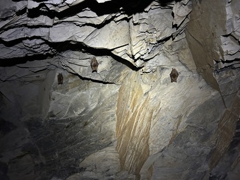 Das Bild zeigt Kleine Hufeisennasen (Fledermausart) in einem Schieferstollen. Es gelten die Nutzungsbedingungen der Mediothek und Pixiothek.