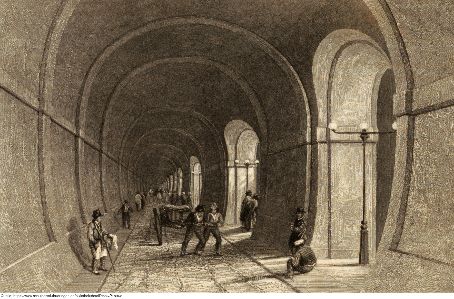 Die Abbildung zeigt den Thames Tunnel, dt. Themse-Tunnel. Er unterquert die Themse in London und verbindet die Stadtteile Rotherhithe und Wapping miteinander. Der Tunnel ist etwa 10 Meter breit und 366 Meter lang. Er wurde 1843 fertiggestellt und war der weltweit erste Tunnel unter einem Fließgewässer.