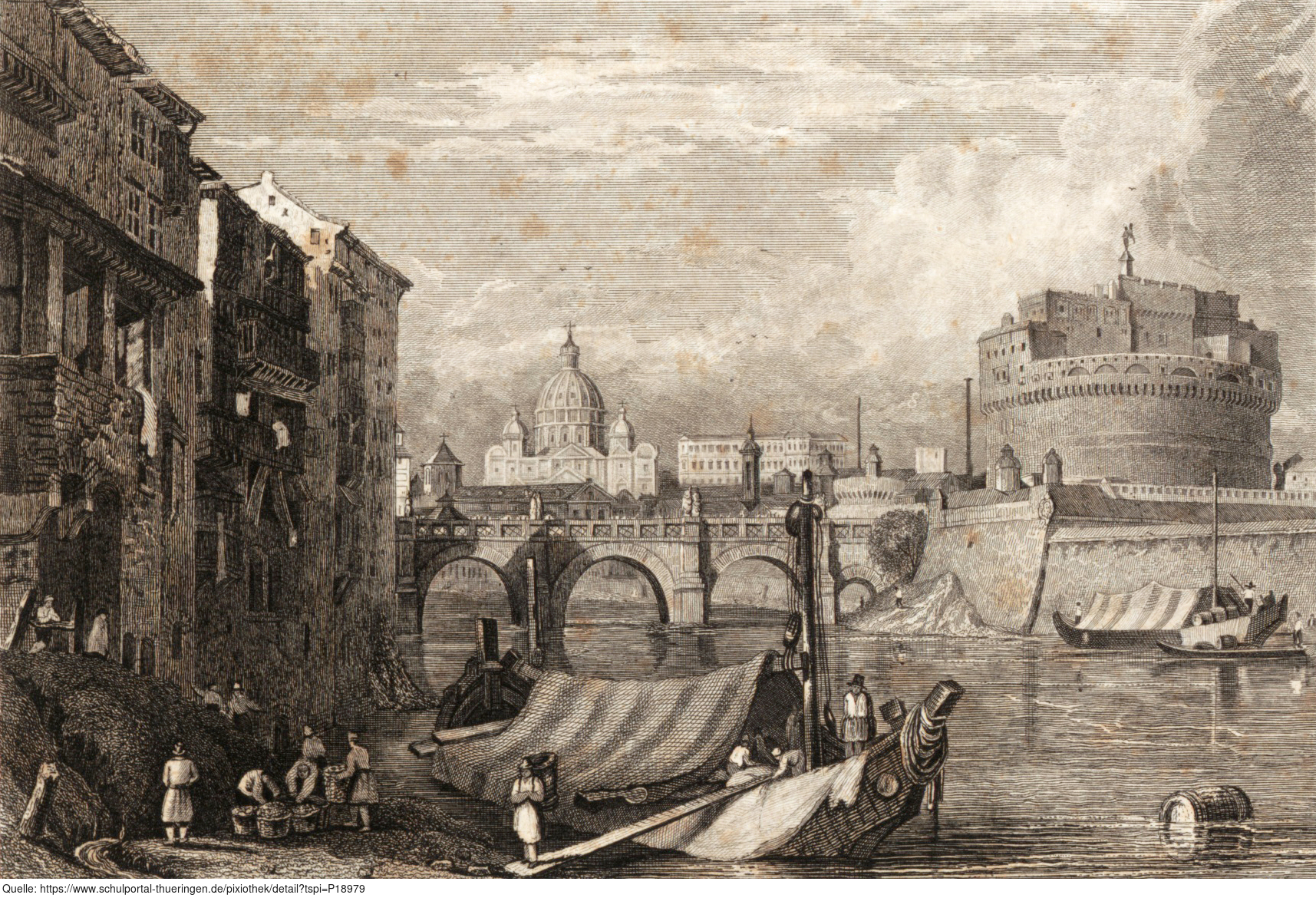 Die Abbildung zeigt einen Blick über die Tiberbrücke auf die Engelsburg (Castel Sant'Angelo), die Peterskirche und den Vatikan in einer historischen Ansicht. Das Bild stammt aus Band 1 von „Meyer's Universum oder Abbildung und Beschreibung des Sehenswerthesten und Merkwürdigsten der Natur und Kunst auf der ganzen Erde“, erschienen 1833. Das Digitalisat ist bei der Universitäts- und Landesbibliothek Düsseldorf unter https://nbn-resolving.org/urn:nbn:de:hbz:061:1-621229 abrufbar. Das Gesamtwerk wurde unter Public Domain Mark 1.0 Universell lizenziert, ist somit gemeinfrei und kann frei verwendet werden.