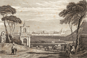 Die Abbildung zeigt eine Landschaft bei Rom mit Blick auf St Peter in einer historischen Ansicht. Das Bild stammt aus Band 1 von „Meyer's Universum oder Abbildung und Beschreibung des Sehenswerthesten und Merkwürdigsten der Natur und Kunst auf der ganzen Erde“, erschienen 1833. Das Digitalisat ist bei der Universitäts- und Landesbibliothek Düsseldorf unter https://nbn-resolving.org/urn:nbn:de:hbz:061:1-621229 abrufbar. Das Gesamtwerk wurde unter Public Domain Mark 1.0 Universell lizenziert, ist somit gemeinfrei und kann frei verwendet werden.