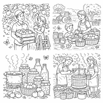 Das Bild zeigt Motive zur Ernte und Verarbeitung von Äpfeln. Es wurde mit Hilfe der KI "Coloring Book Hero" erstellt.