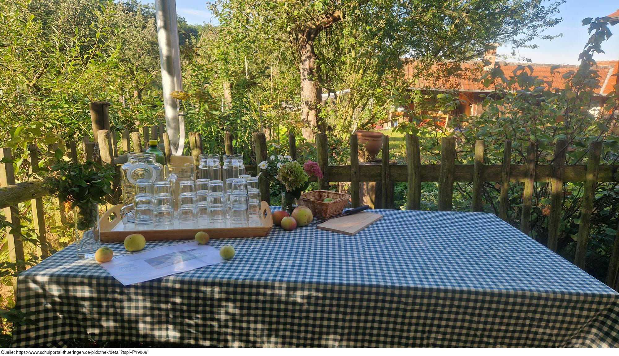 Das Bild zeigt eine Ansicht auf dem ApfelGut Erfurt. Auf einem Tisch mit einer blau-weiß karierten Tischdecke stehen Gläser, Karaffen und Äpfel bereit. Im Hintergrund befindet sich ein Holzzaun, der das Areal begrenzt. Es gelten die Nutzungsbedingungen der Mediothek und Pixiothek.