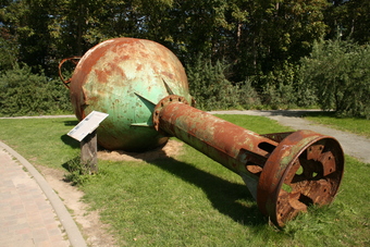 Abgebildet ist eine 10 Meter lange Tiefwassertonne Typ TWT mit einem Durchmesser von 2,60 Meter, ausgestellt auf Kap Arkona. Bis 1979 befand sich die Boje in der Ostsee vor der Stubbenkammer, bis sie im Winter 179/1980 durch die Last des Eises kenterte und unterging. 25 Jahre später fand man sie auf dem Grund der Ostsee wieder. Das Wasser- und Schifffahrtsamt ließ die Tonne bergen und auf Kap Arkona nebst einer Schautafel ausstellen.