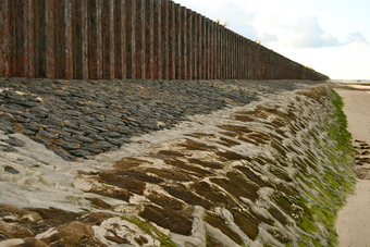 Abgebildet ist eine Spundwand vor den Dünen.