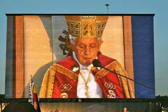 Abgebildet ist Benedikt XVI. auf der Videowand.