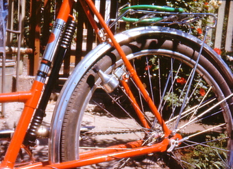 Abgebildet ist ein Fahrraddynamo am Hinterrad eines Damenfahrrades.