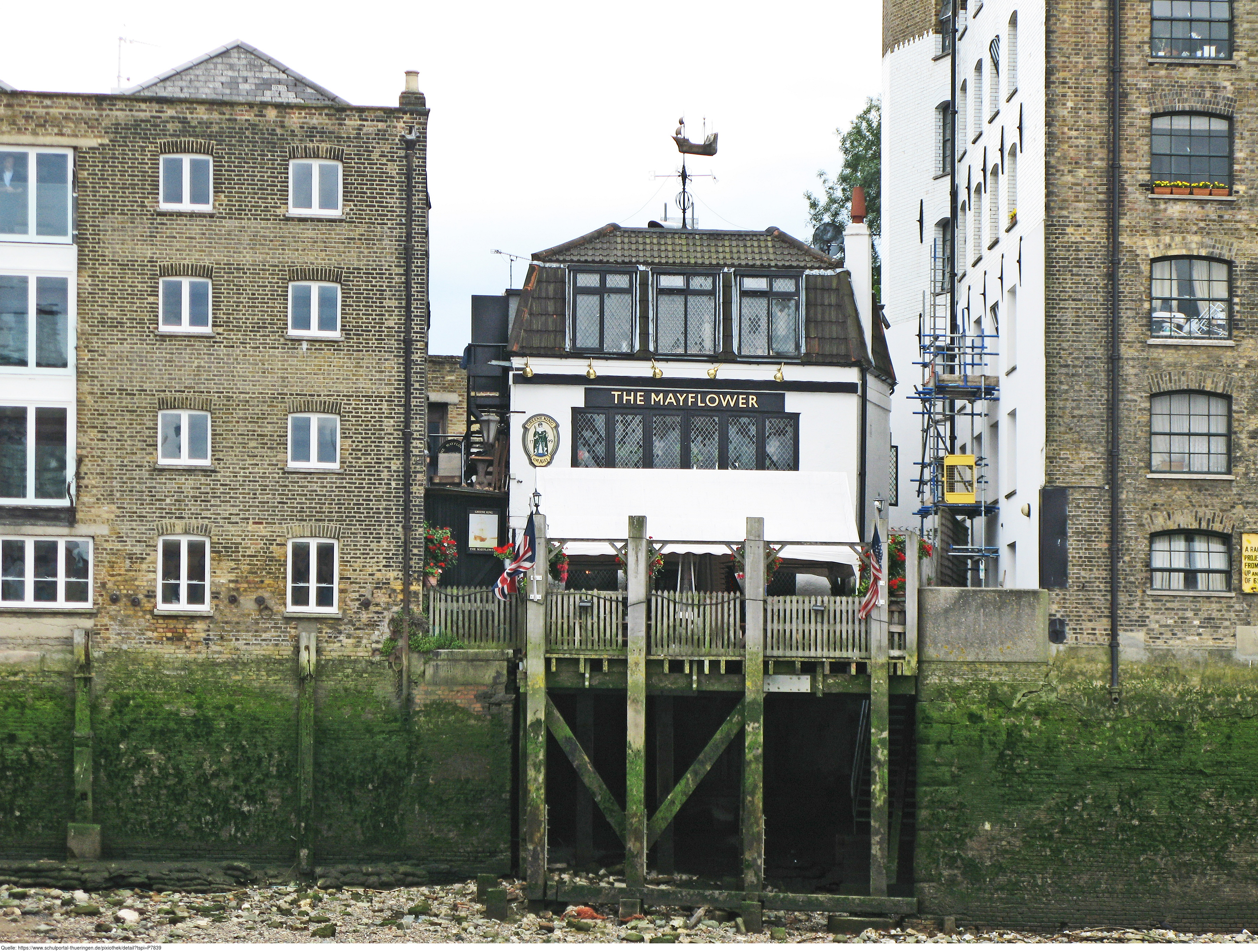 Das Foto gehört zur Serie London 2016. Es zeigt "The Mayflower Pub", 117 Rotherhithe St, London SE16 4NF. Im Juli 1620 nahm das Schiff Mayflower 65 Passagiere an seinem Londoner Heimatort Rotherhithe an der Themse an Bord. Die Mayflower fuhr weiter nach Southampton, um Vorräte aufzunehmen. Am 6. September 1620 segelte Captain Jones zusammen mit 102 Passagieren und etwa 30 Besatzungsmitgliedern von Plymouth aus Richtung Amerika. Um die Rechtsordnung in ihrem neuen Heimatland zu schaffen, vereinbarten die Siedler an Bord den "Mayflower Compact", das erste schriftliche Regierungsdokument in den heutigen Vereinigten Staaten. Es gelten die Nutzungsbedingungen der Mediothek und Pixiothek.